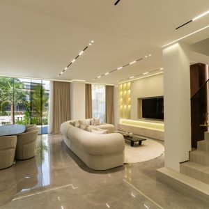 Brief – The contemporary house interior design for this villa is characterized by defining features and textures and attention to every detail. The overall palette of the house is neutral, which brings out the sophisticated furniture.